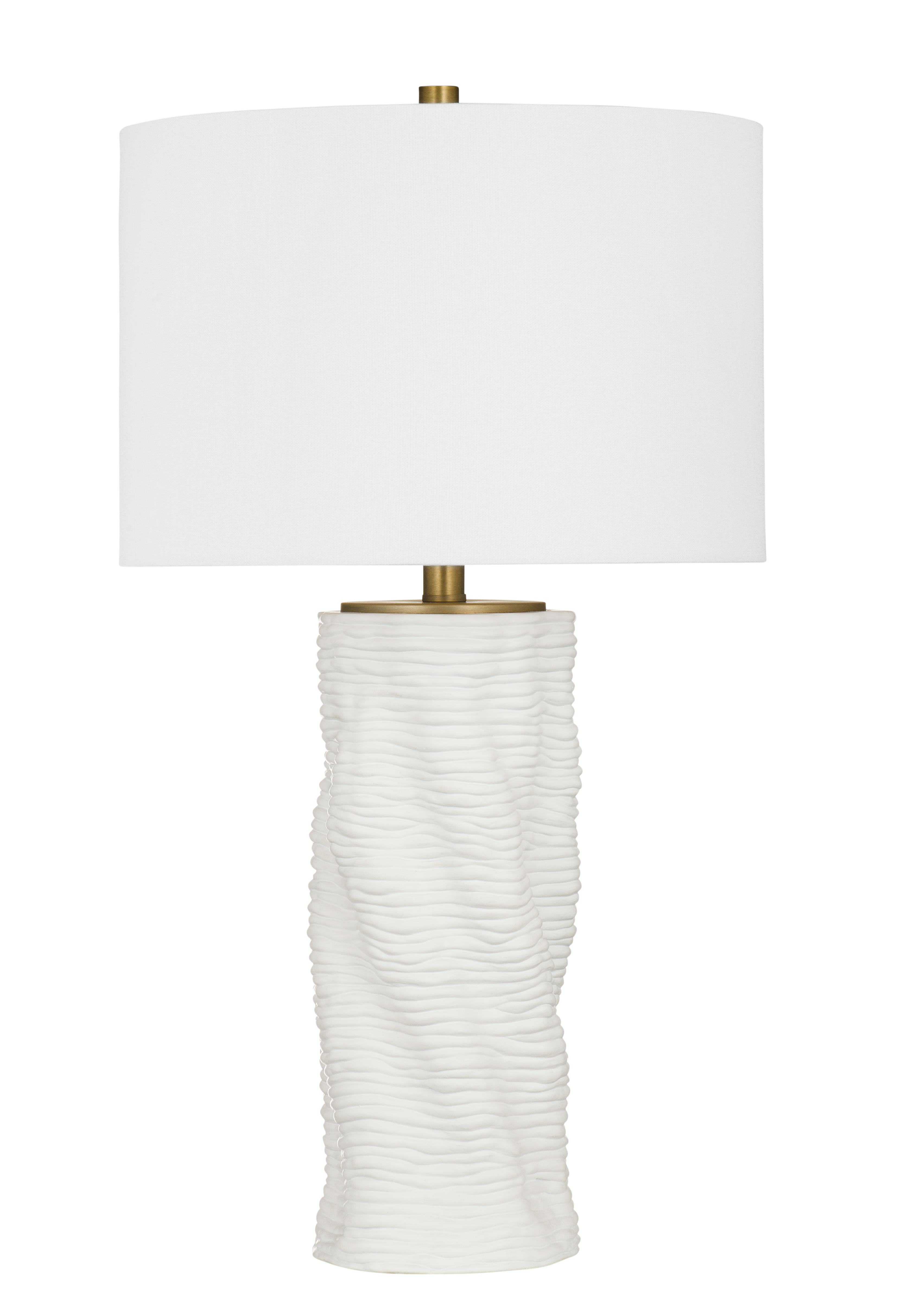 The Delancy Table Lamp features a tall, gently tapered silhouette with an organic, rippled texture throughout the base. The base is finished in matte white with brass accents at the neck. Constructed of resin, the lamp is paired with a white linen drum shade.